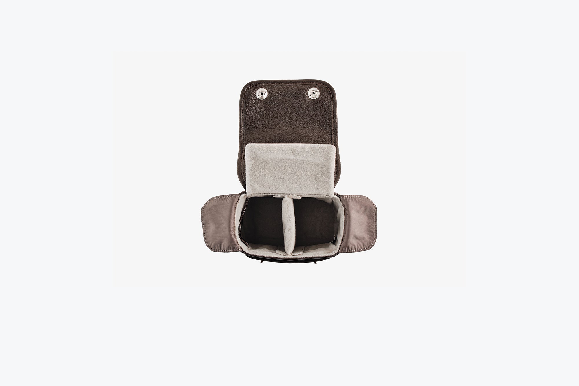 The bag offers space for a camera body with lens as well as accessories such as batteries, SD cards and charging cables. An integrated screen protector protects the camera display and also serves as additional padding. The customizable divider pad allows for flexible internal partitioning, while SD cards can be stored in practical leather compartments for easy access.
