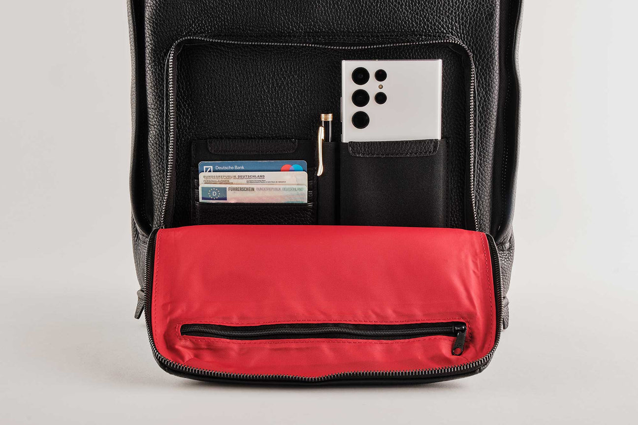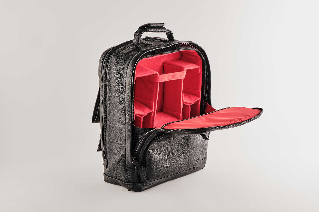 Like our photo bags, our backpack is both elegant and casual. Made in Germany from milled, full-grain cowhide, our backpack also impresses with its velvety-soft feel and sporty, elegant look. It offers enough space for a reflex camera, lenses and other photo equipment such as flashes or batteries. The removable inner pocket is covered with the durable and water-repellent fabric CORDURA® as well as lined with soft, individually adjustable padding.