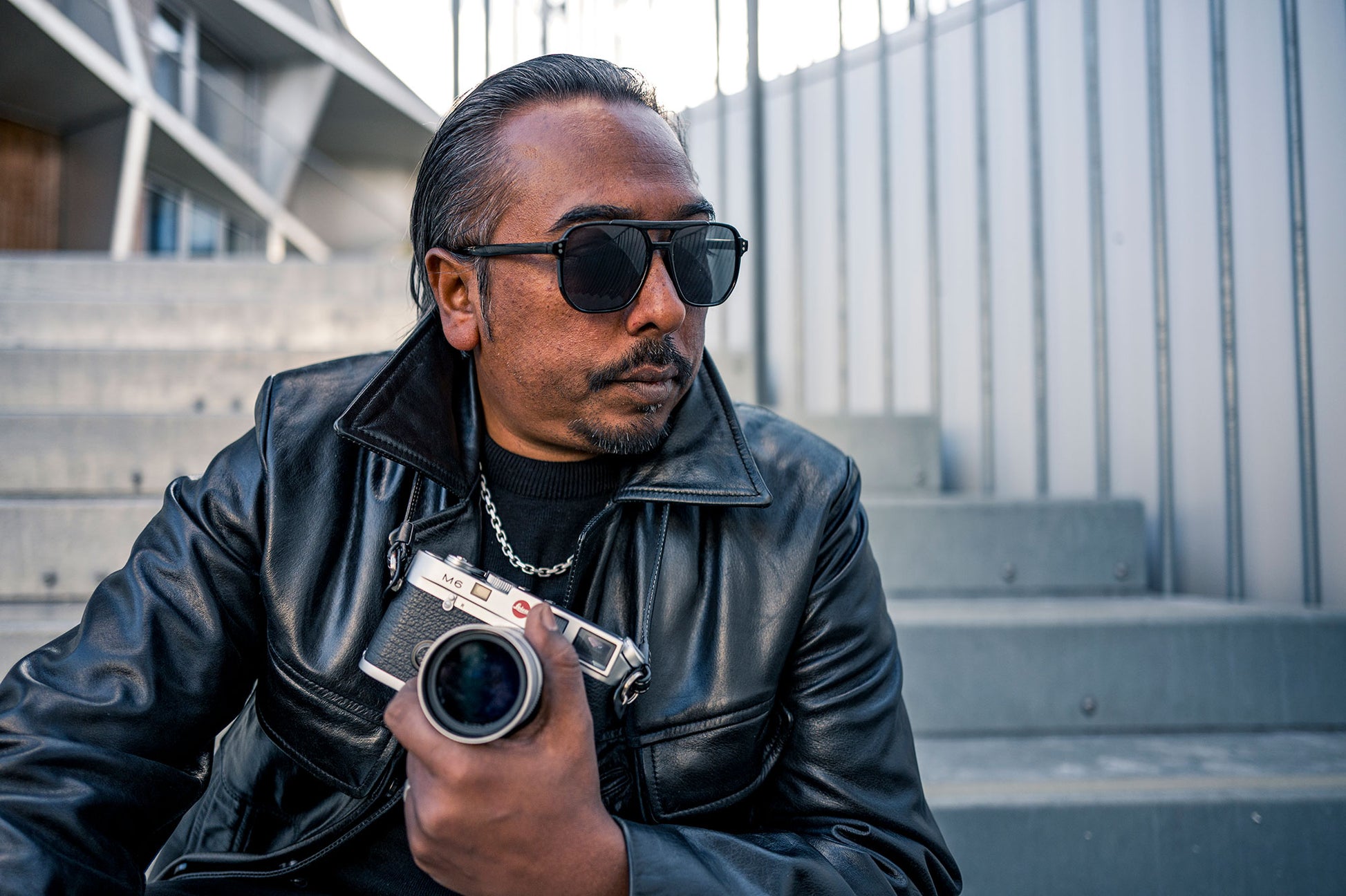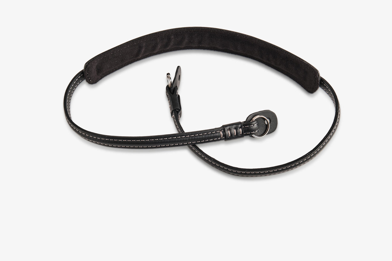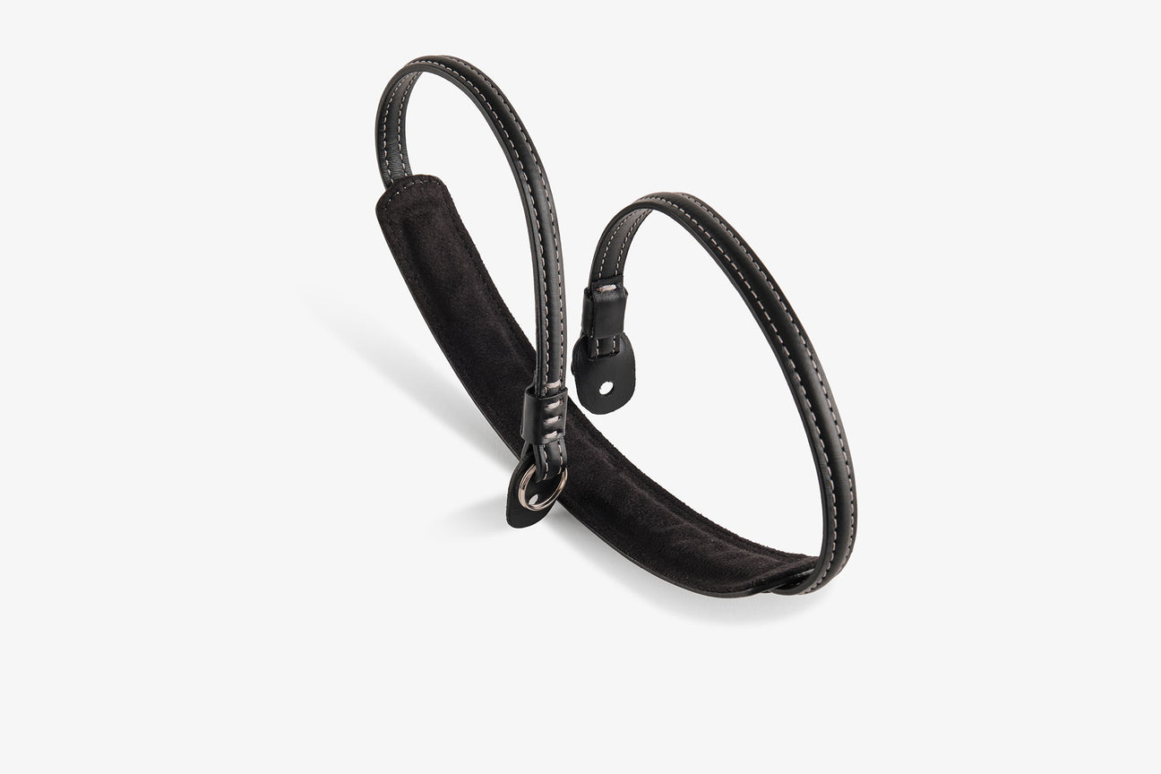The finest vegetable-tanned leather in classic black with silver decorative stitching pays homage to the iconic cameras of street photography - Leica M, Fuji X and Canonet. With its short length of 70 cm, the strap is ideal for street photographers who want to carry their camera close to the body and within easy reach - ideal for unobtrusive, intuitive work. An internal metal wire and a special technical textile ensure maximum cut protection and dimensional stability. The soft padded neck element distributes the weight evenly and ensures long-lasting comfort. Carefully finished seams and protective leather panels prevent scratches on the camera.