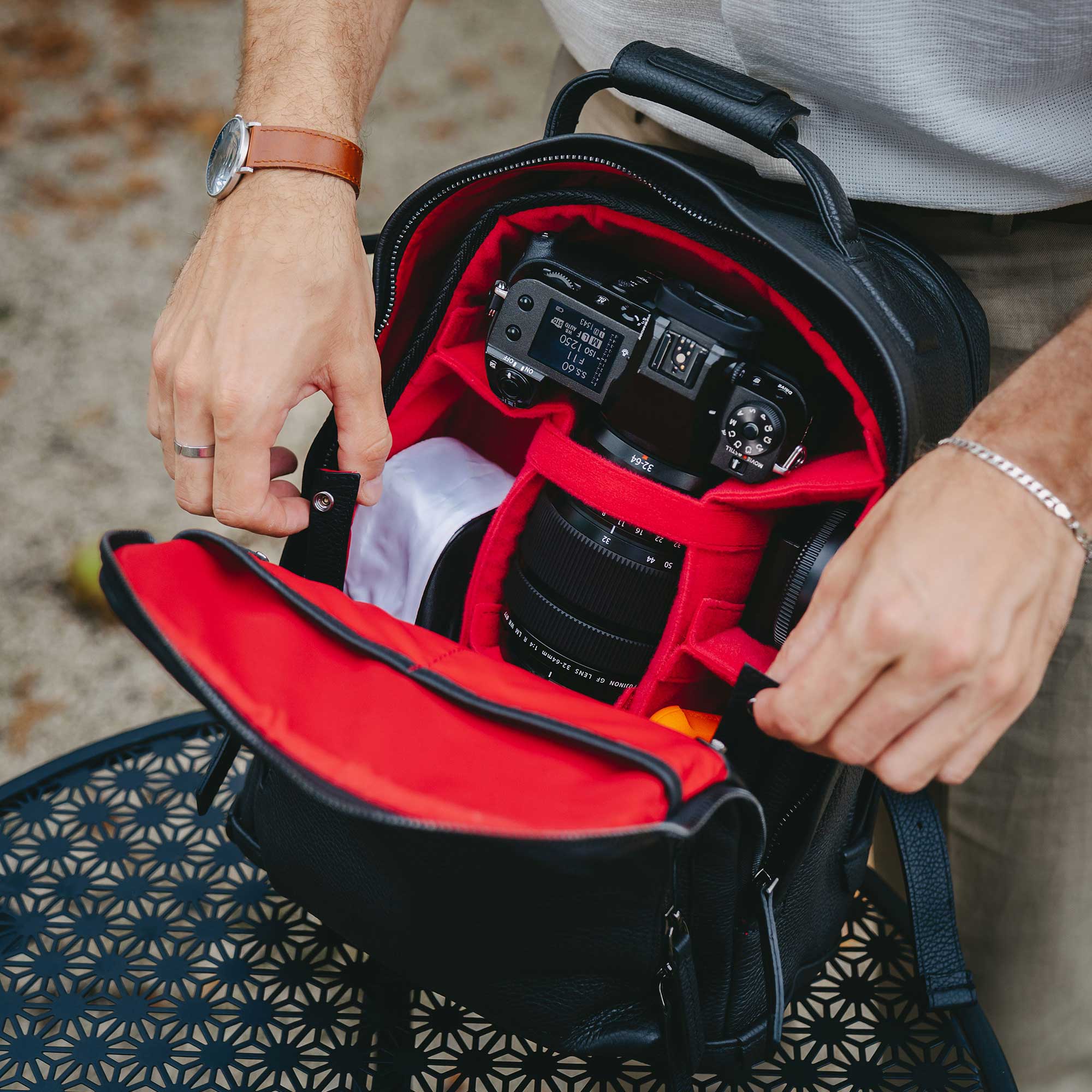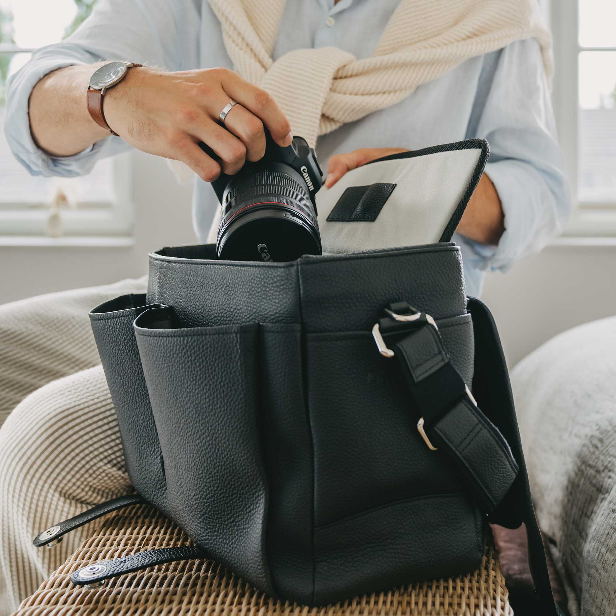 Si lleva un equipo completo (cuerpo de cámara, varios objetivos, ordenador portátil y accesorios), nuestras mochilas para cámaras distribuyen el peso uniformemente entre los hombros. El cuero de curtido vegetal de alta calidad desarrolla una pátina única con el paso del tiempo, mientras que los compartimentos interiores acolchados mantienen a salvo tu equipo Canon, Nikon, Sony o Leica.