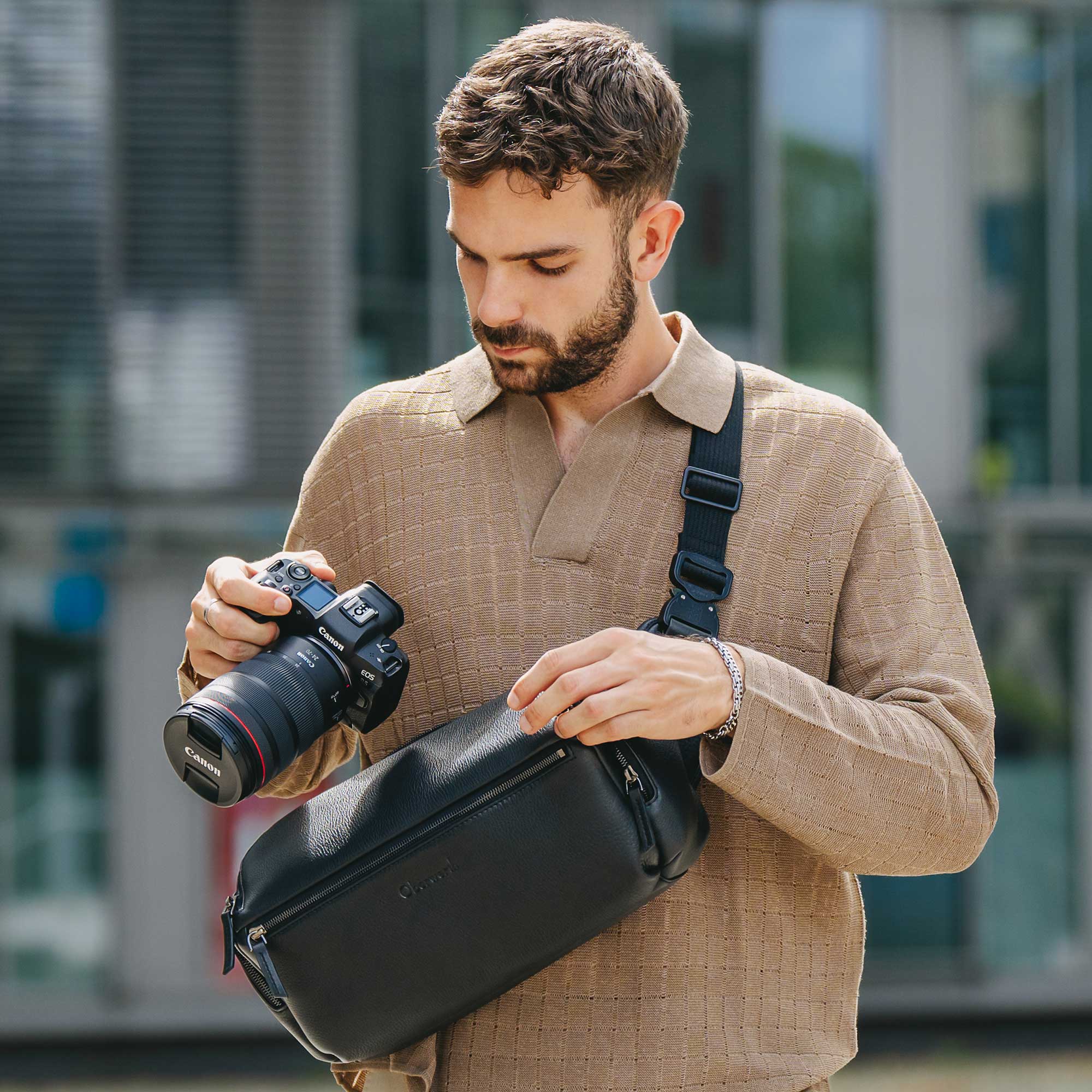Acceso rápido y diseño elegante. Nuestras bolsas bandolera para cámaras se abaten de atrás hacia delante con un movimiento fluido, lo que permite tener la cámara sin espejo al alcance de la mano al instante. Los fotógrafos de calle y los documentalistas eligen las bolsas bandolera por su combinación de rapidez y discreción.